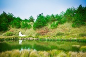 晴天下倒影如鏡的藍茵湖, 湖邊綠草如茵、恬靜的高山湖泊景象,宛如身在西方國度,心曠神怡。